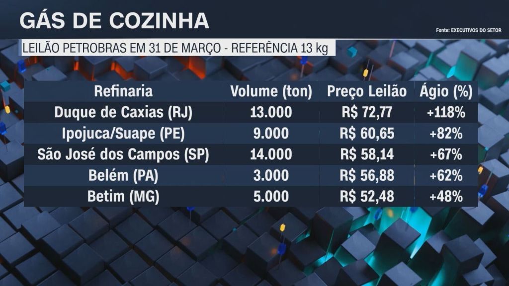 Em Duque de Caxias, foram comercializadas 13 mil toneladas de gás de cozinha a R$ 72,00, representando um ágio de 118%. Em Ipojuca, Pernambuco, o volume negociado foi de 9 mil toneladas a R$ 60,65, com ágio de 82%.