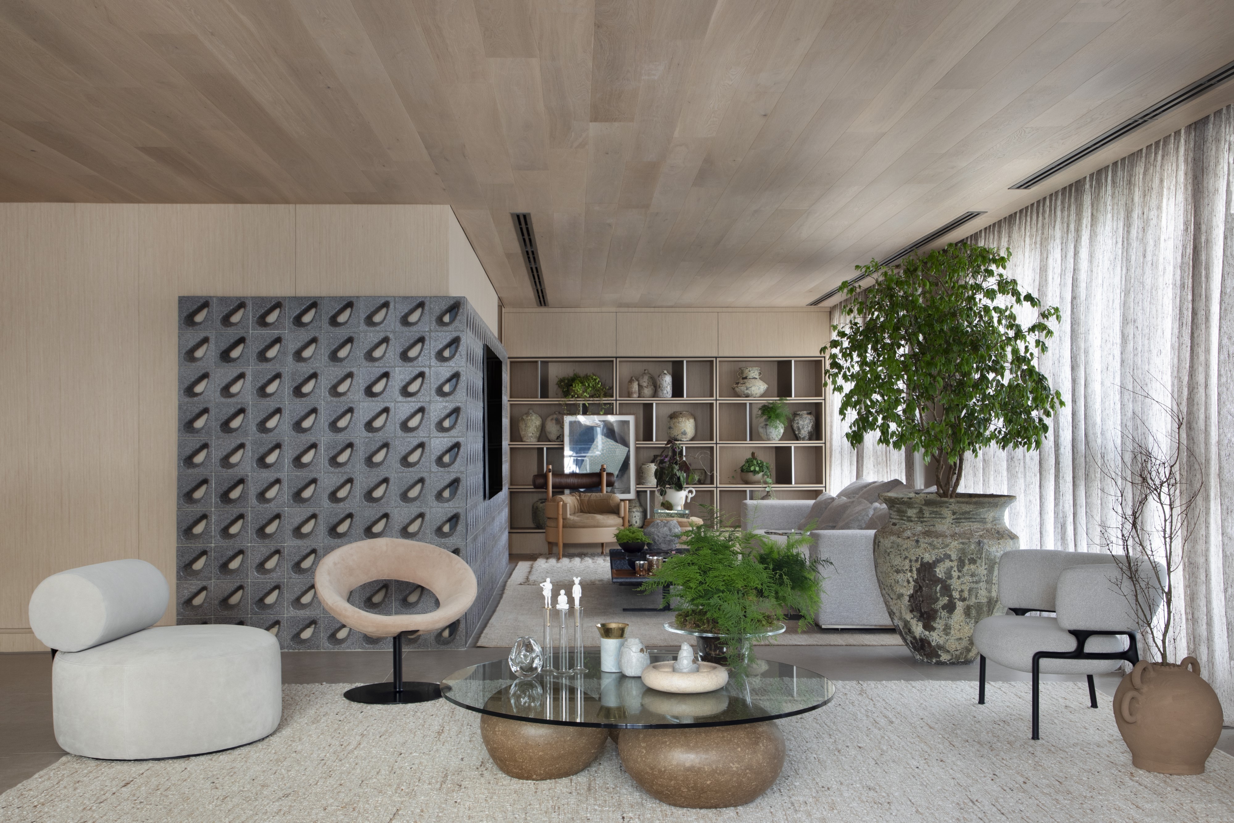 As materialidades dão o tom do apartamento. O forro de carvalho europeu percorre toda a morada, enquanto cobogós produzidos a partir de conchas de sururu filtram a luz e, para Granatti Junior, conectam “a casa à poesia da matéria brasileira”. Na cozinha gourmet, uma bancada de cinco metros de madeira organiza a área social integrada. No lavabo, o destaque é o travertino.