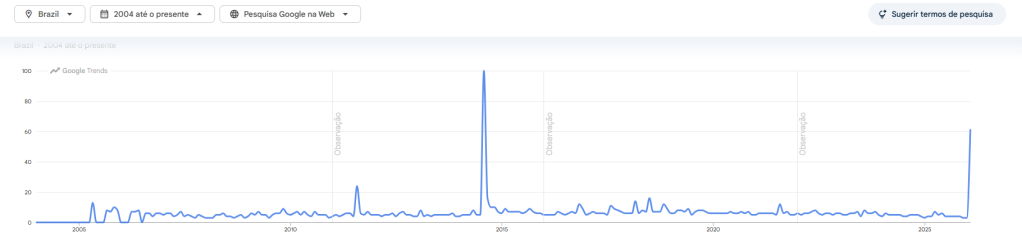 Um levantamento feito pela CNN Brasil mostra que desde a plataforma passou a contabilizar as buscas, em 2004, o pico de pesquisas pelo termo só não foi maior do que em 2014, quando viralizou o desafio Ice Bucket Challenge, conforme mostra o gráfico.